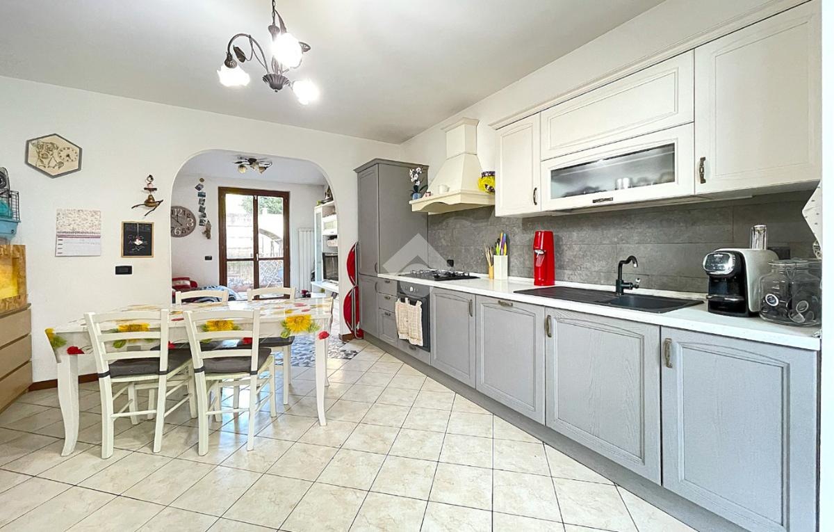 L'ingresso offre accesso alla sala da pranzo dotata di cucina a vista ed è comunicate con l'area adibita a soggiorno/relax, direttamente collegata al comodo giardino di proprietà.