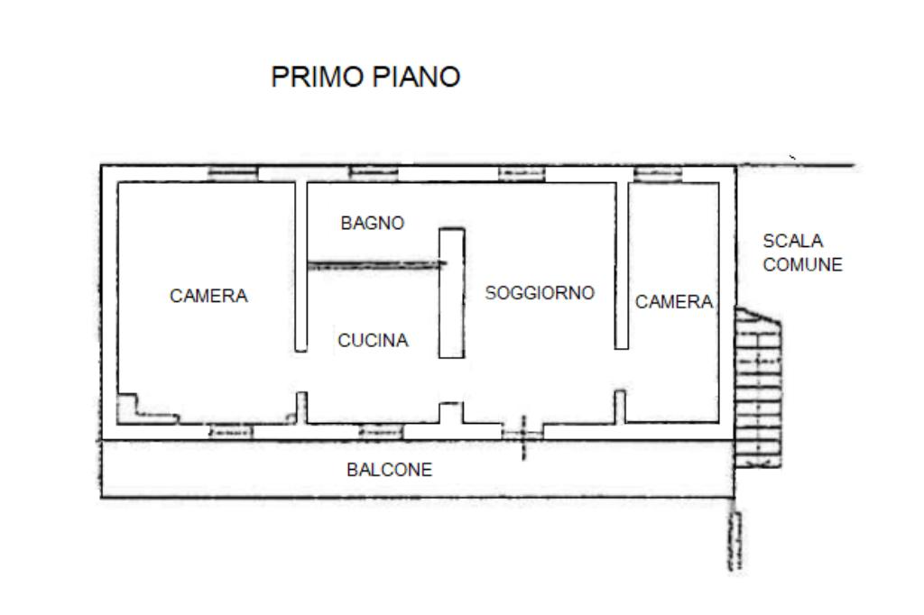 L'appartamento è posto al primo piano non servito da ascensore ed è composto da ingresso sull'ampio soggiorno, cucina abitabile e separata, camera matrimoniale, cameretta e locale servizi finestrato e dotato di box doccia.