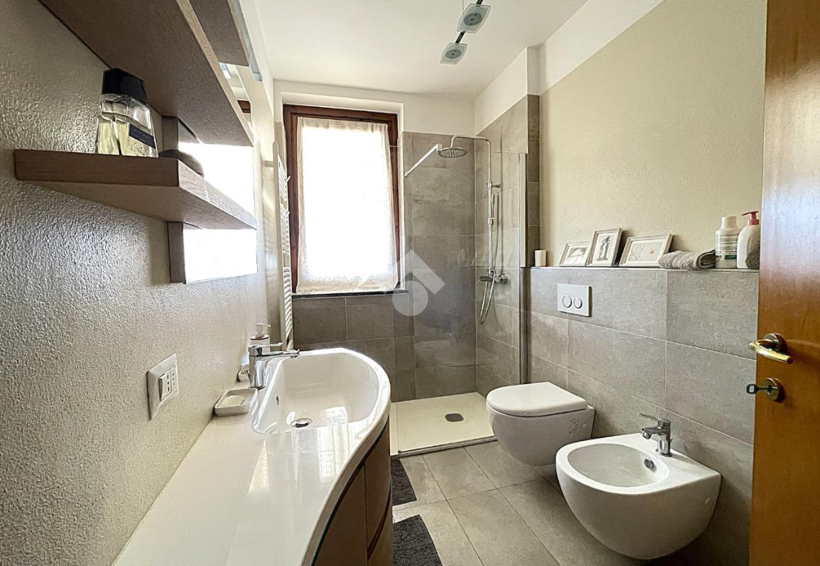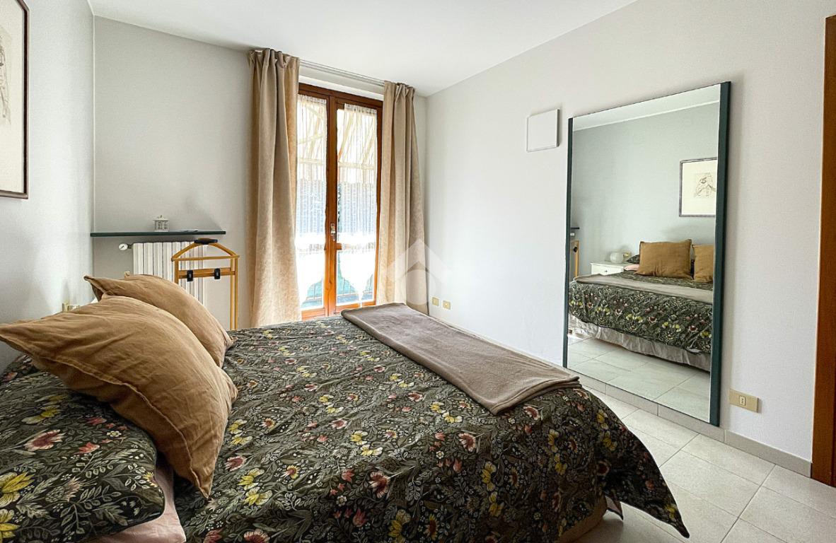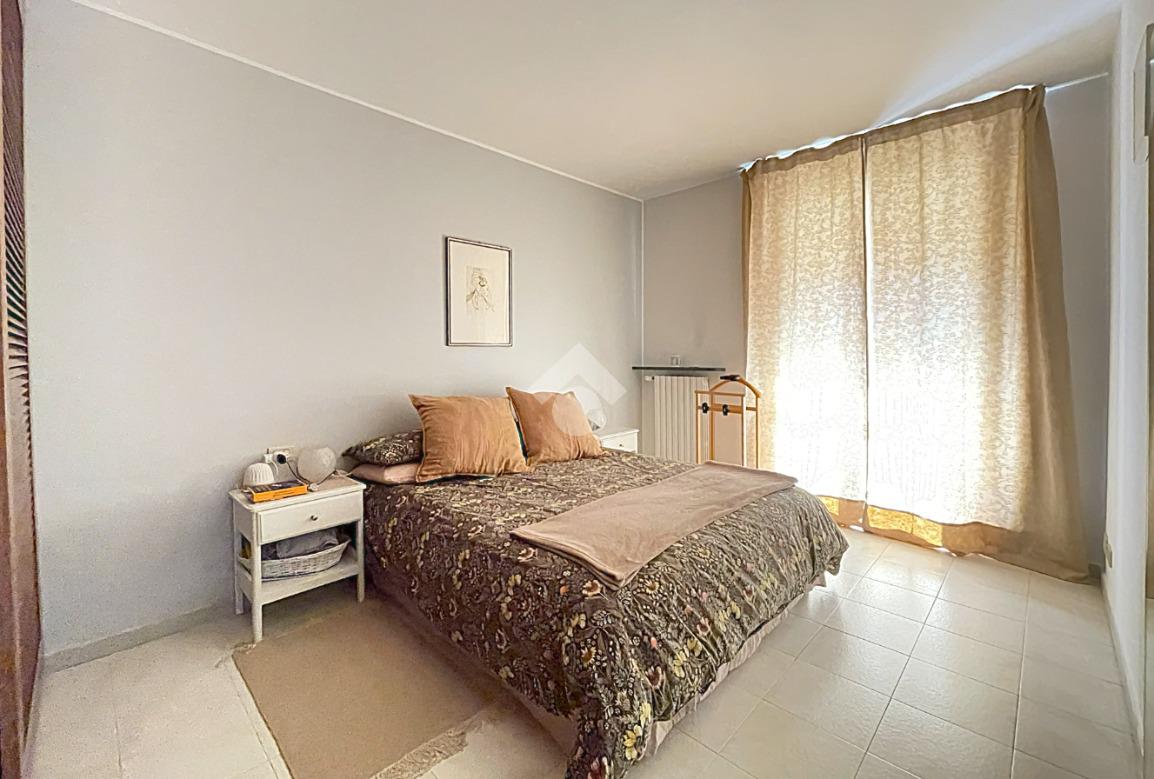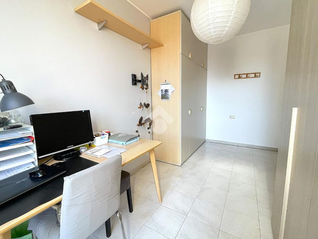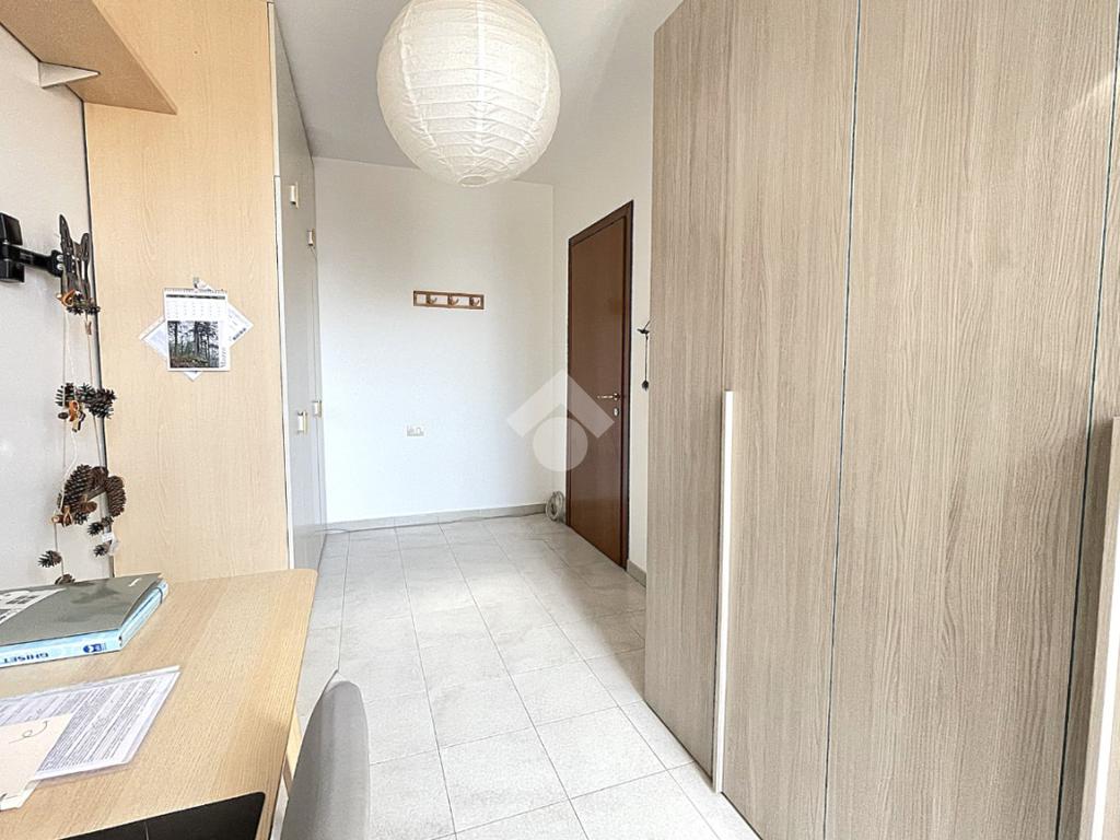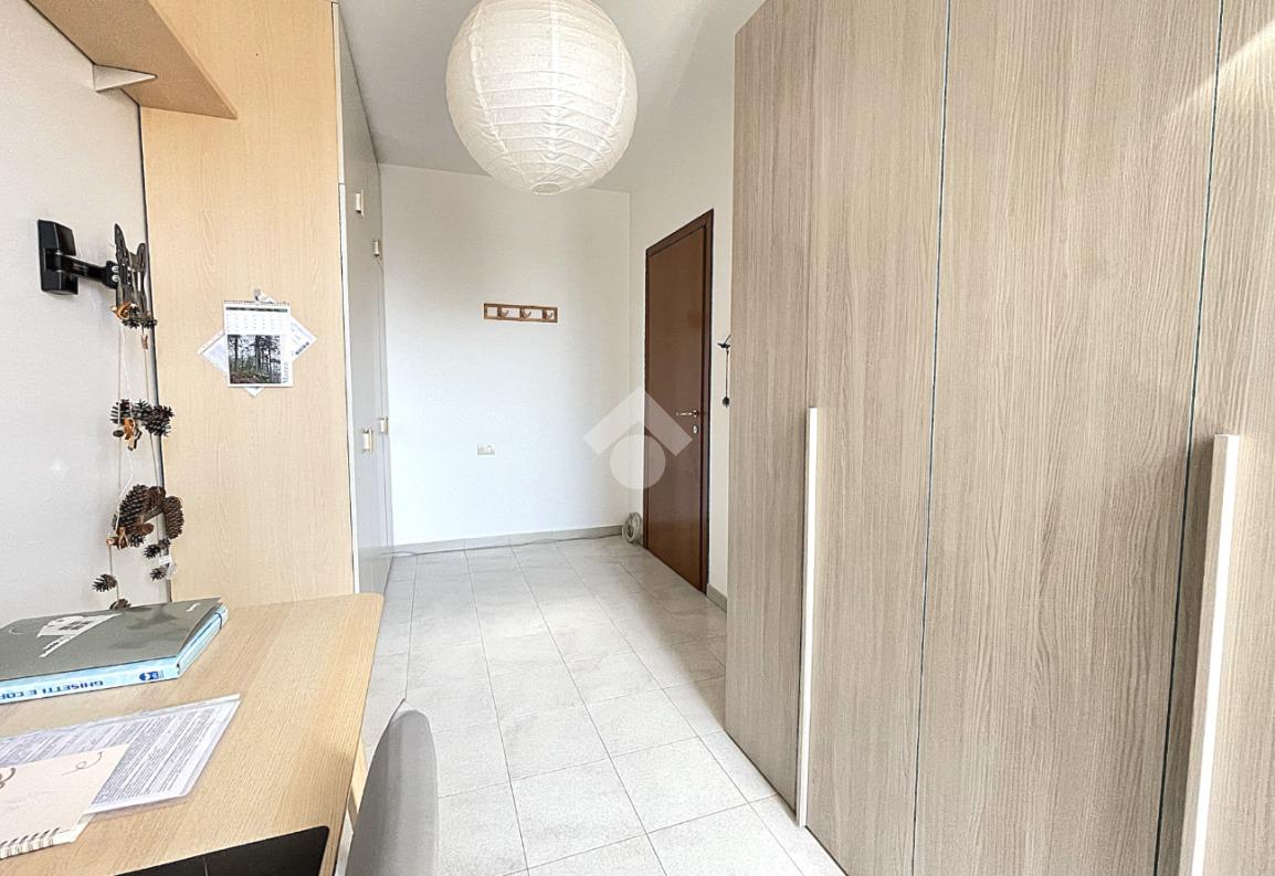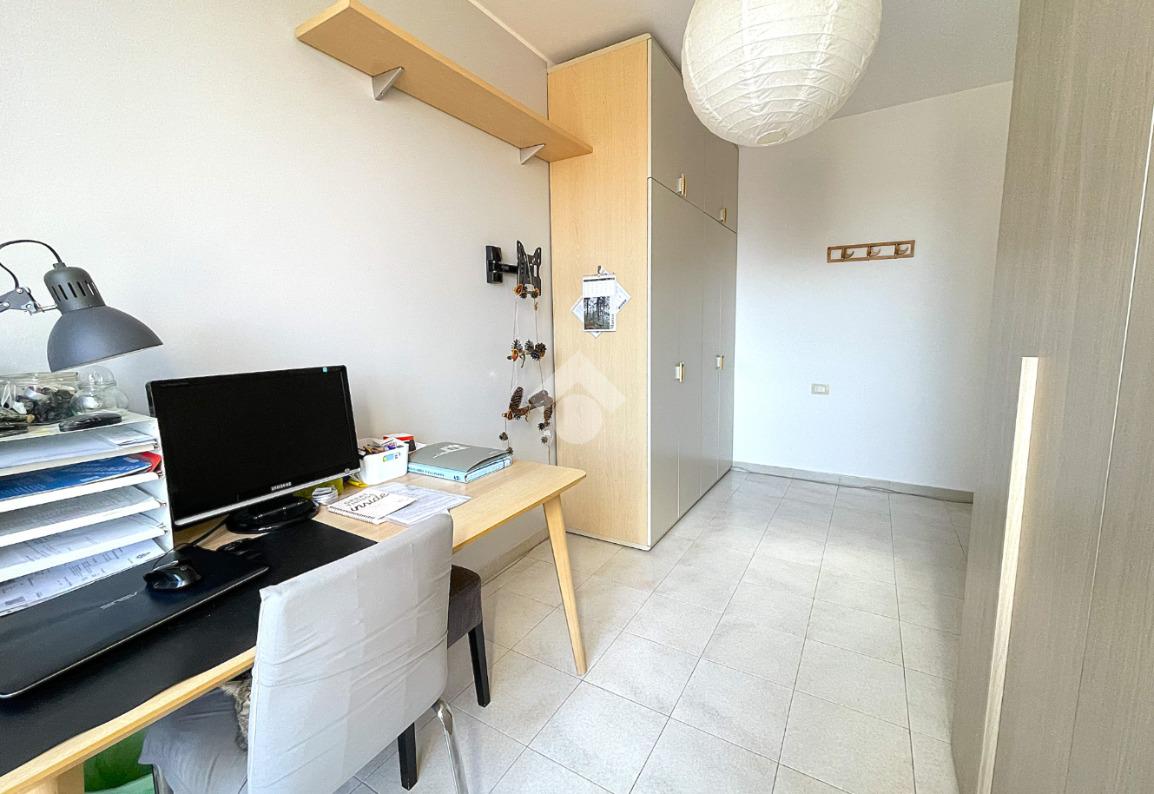 La zona notte è separata da un pratico disimpegno che accompagna alla camera matrimoniale dotata di porta finestra, alla cameretta anch'essa munita di porta finestra e al locale servizi finestrato, completamente ristrutturato, dotato di sanitari sospesi e box doccia 'walk in'. Entrambe le camere godono di un affaccio sul secondo balcone, dotato di tenda solare automatizzata con sensore del vento.