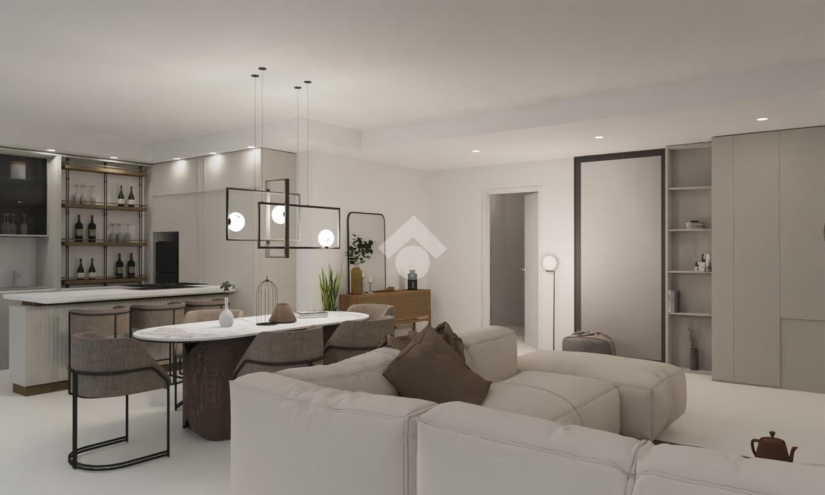 L'ingresso indipendente conduce all'ampio salone di 50 mq, dotato di cucina a vista e collegato al giardino da una porta finestra di ben 4 m di larghezza, capace di offrire una vista completa sul dehor esterno e arricchire l'ambiente di aria e luce naturale.