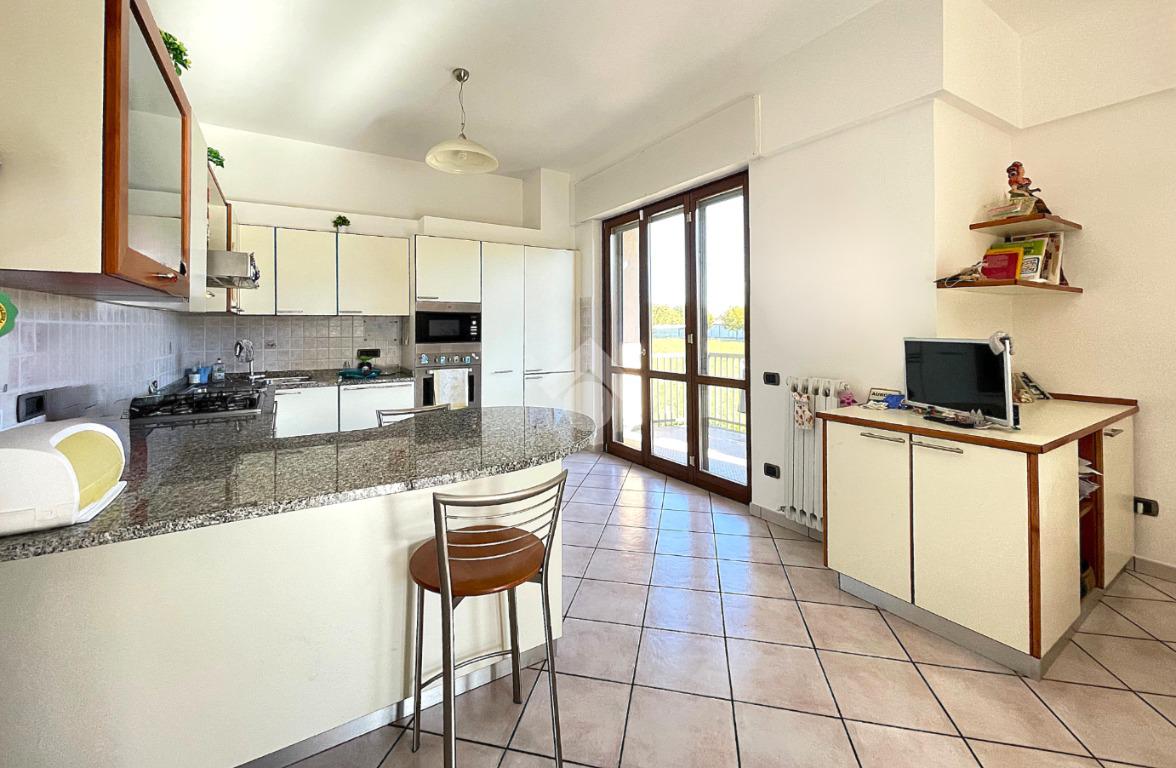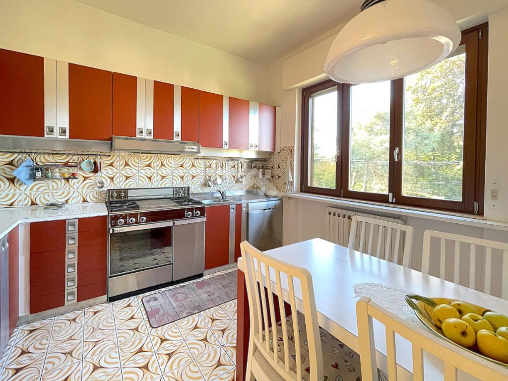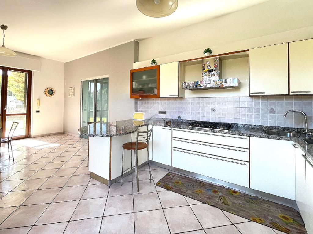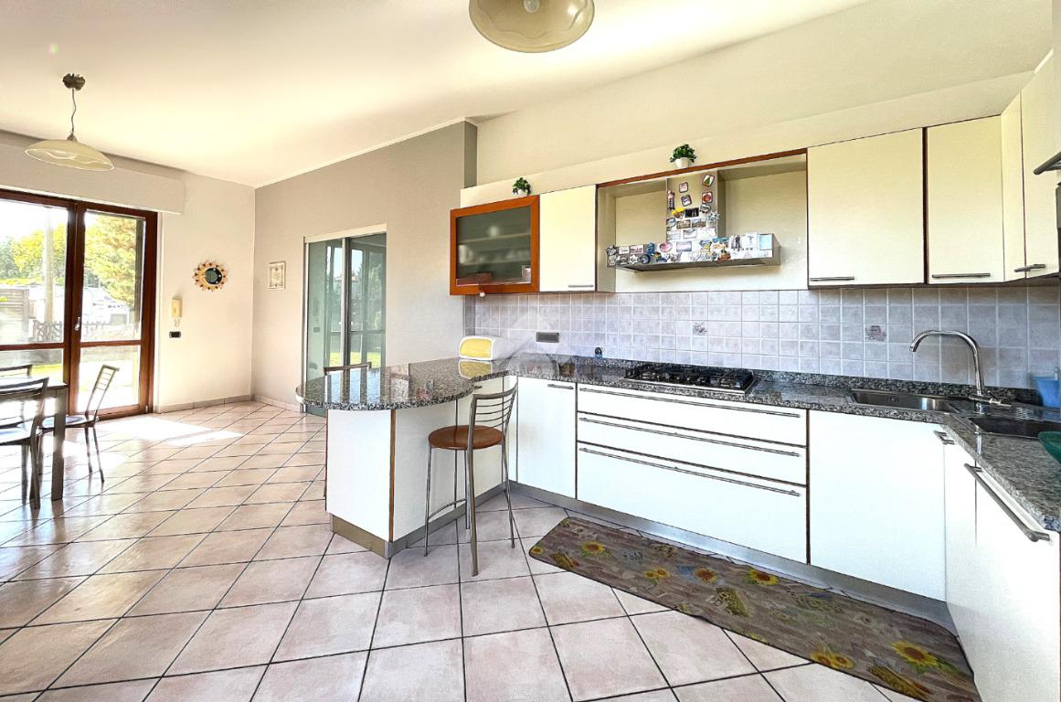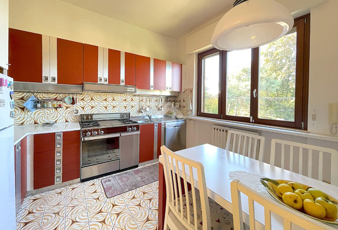 La cucina abitabile comprende anche una zona pranzo e un diretto accesso all'area del porticato coperto.