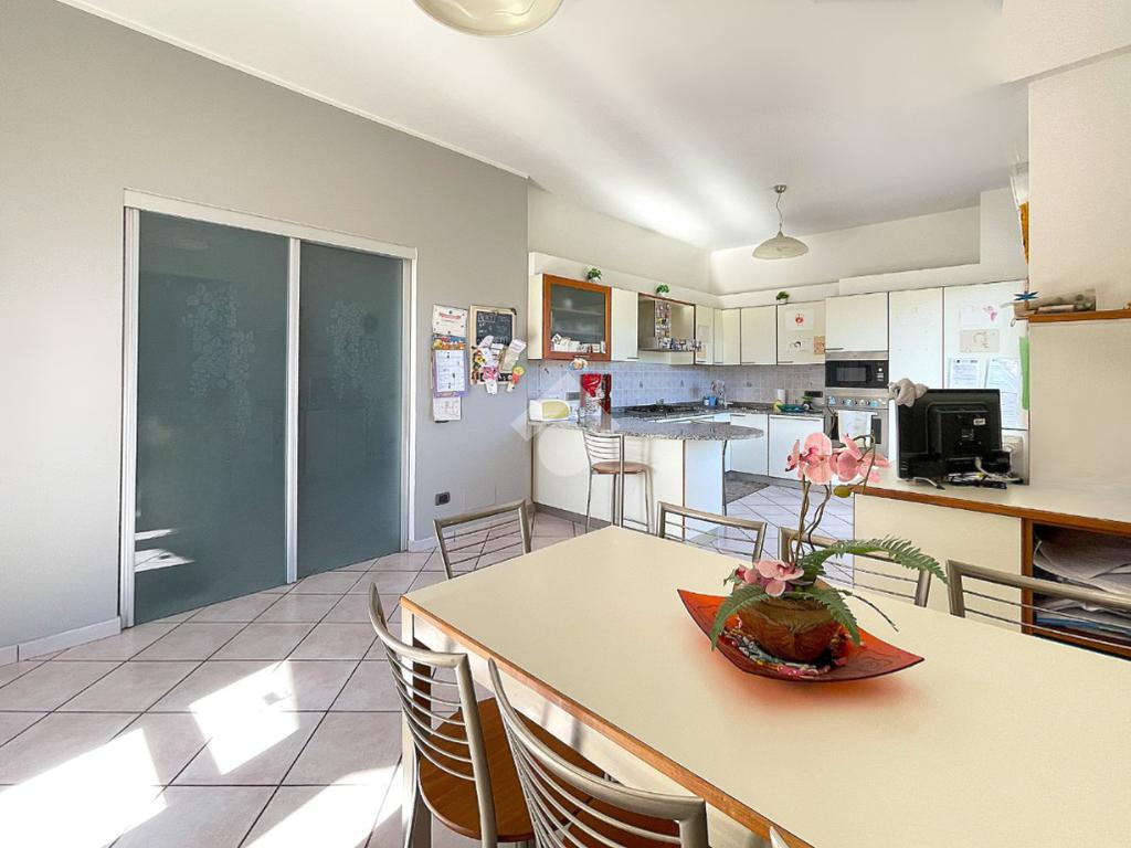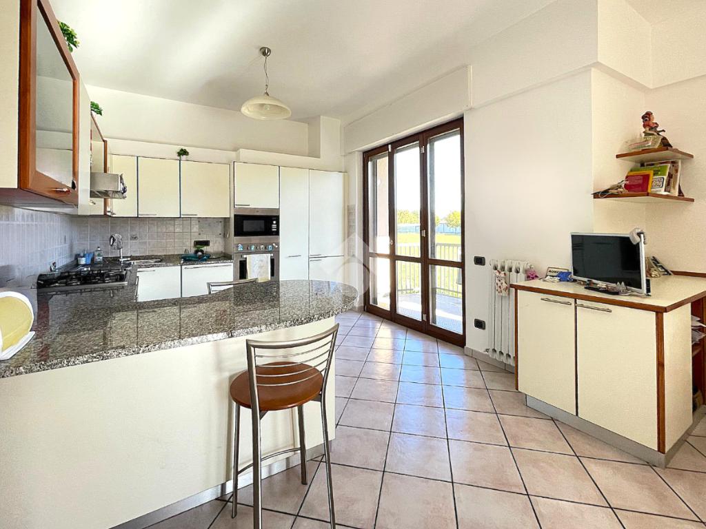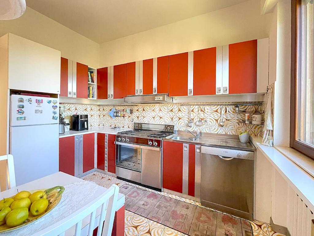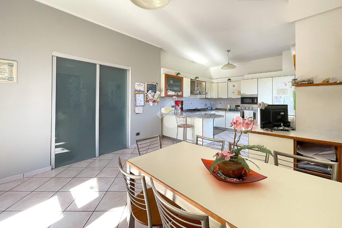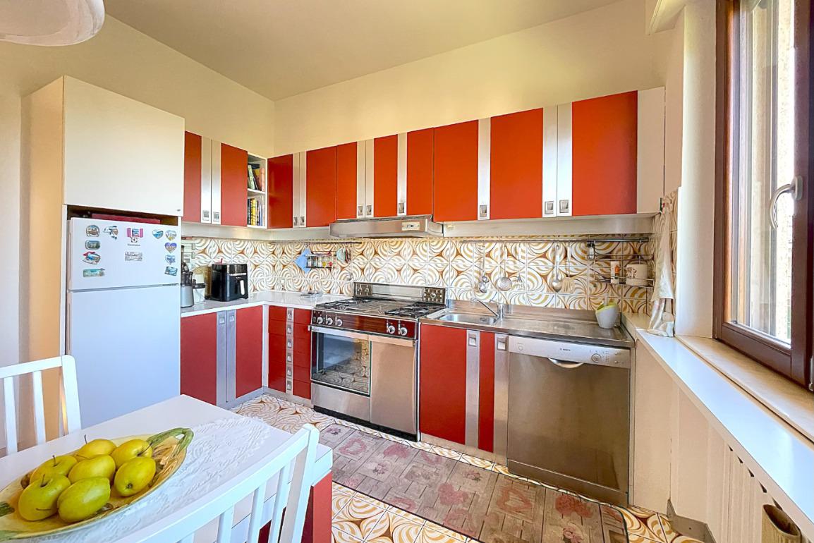 La cucina abitabile comprende anche una zona pranzo e un diretto accesso all'area del porticato coperto.
